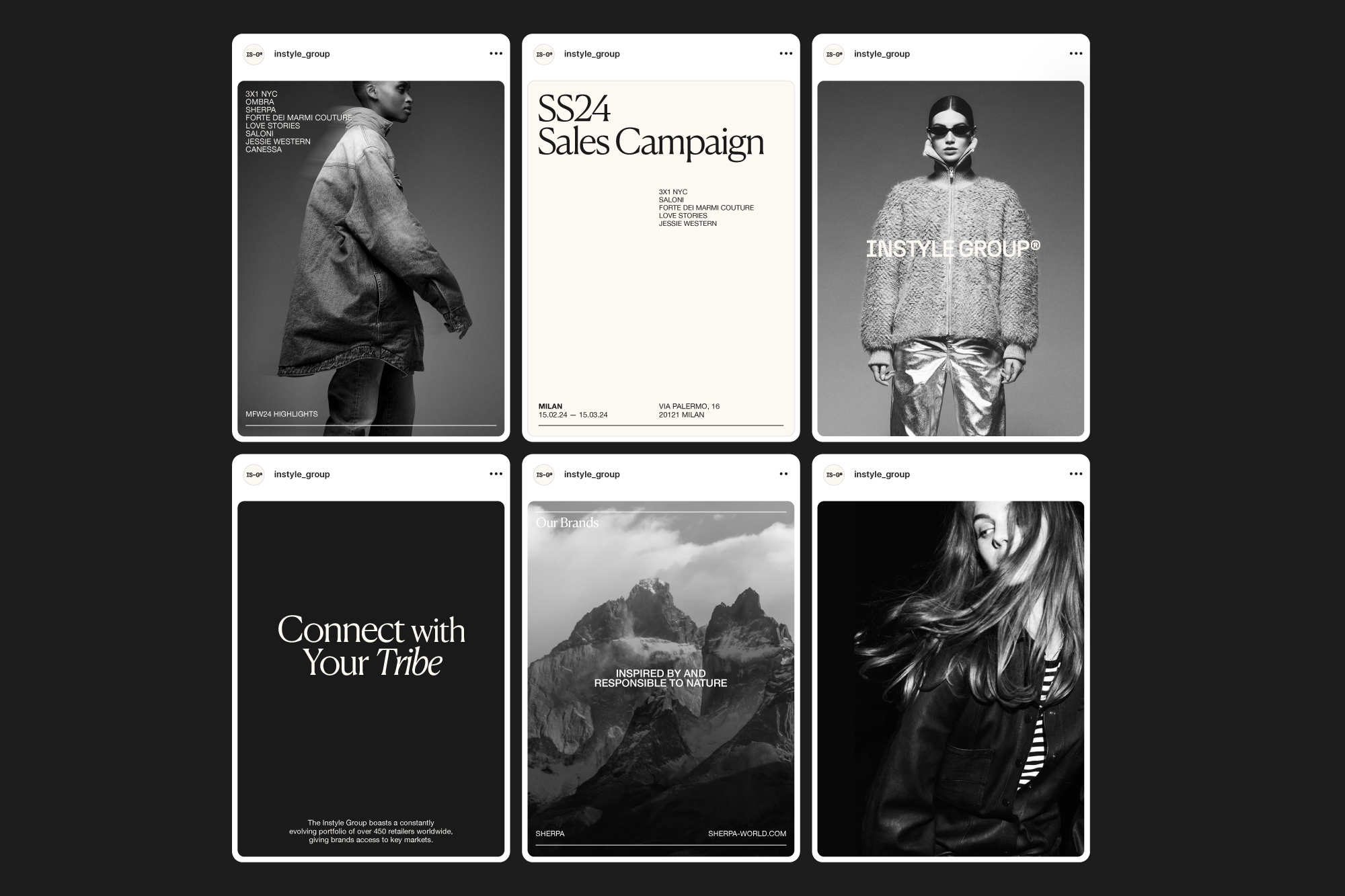 The Instyle Group is an Italian high-contemporary fashion production and distribution company. Expanding from a fashion showroom, the newly established group is touted as a one-stop-shop for fashion brands: from production to distribution and from showroom to marketing communication. As a fashion group, the visual identity for Instyle Group needed to be visually neutral and at the same time, able to represent its unique brands.
